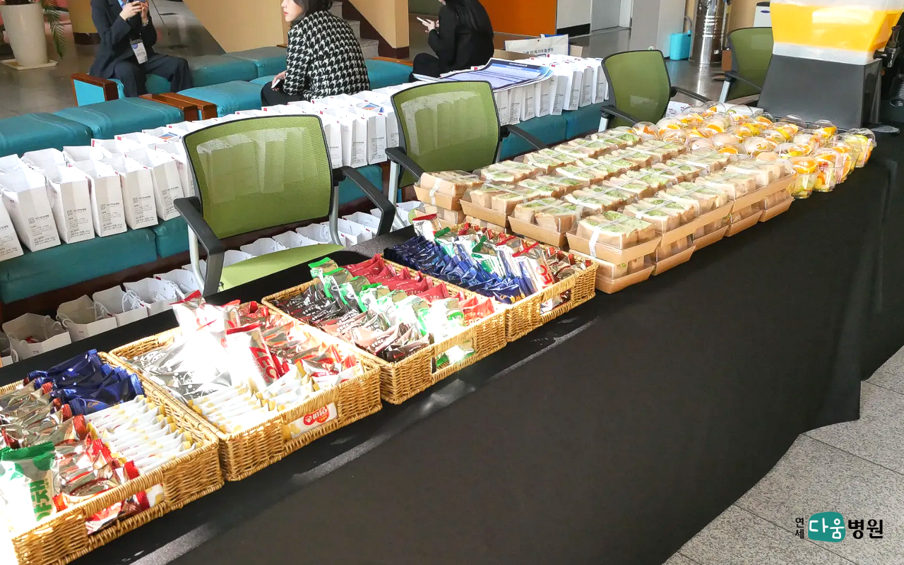 행사장에는 참석자들을 위해 커피, 샌드위치, 다양한 과자와 음료가 준비되어