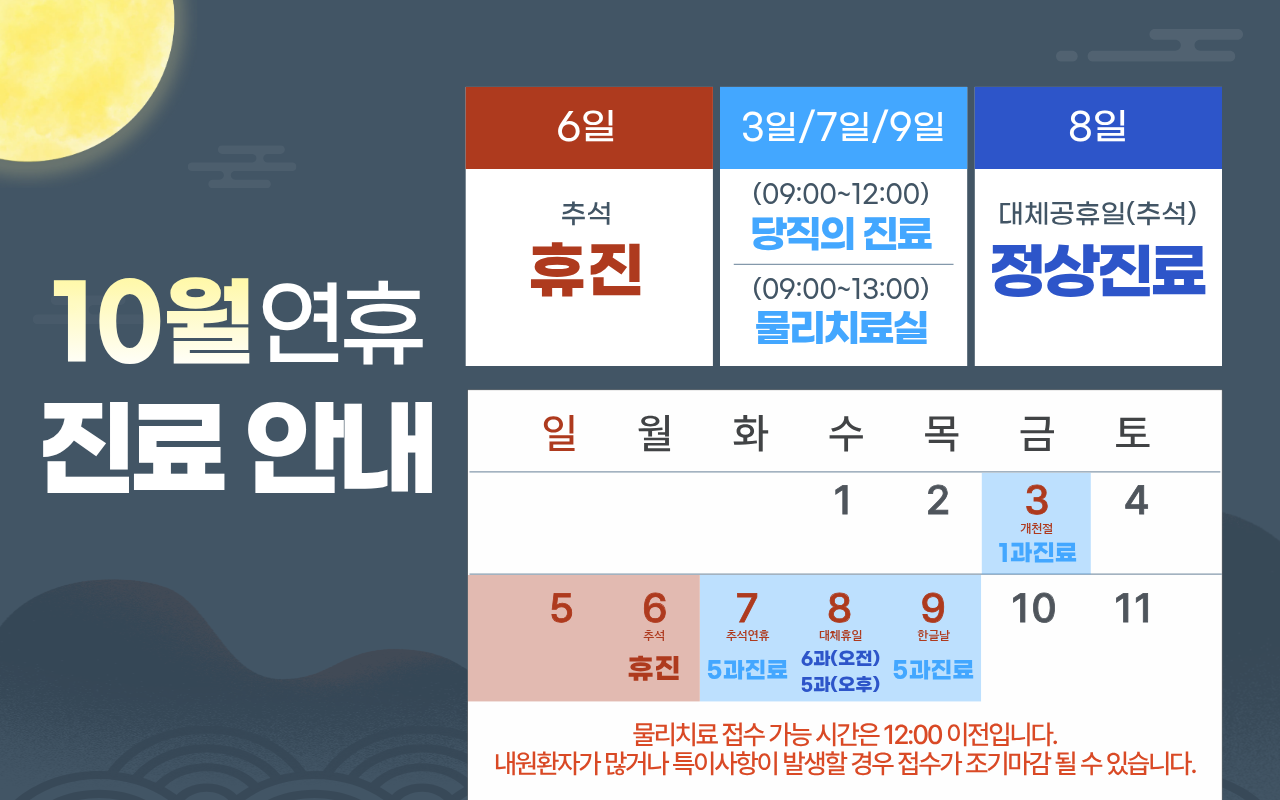 10월 3일,7일,9일(개천절,한글날): 당직의진료 09:00~12:00 / 물리치료실 09:00~13:00